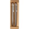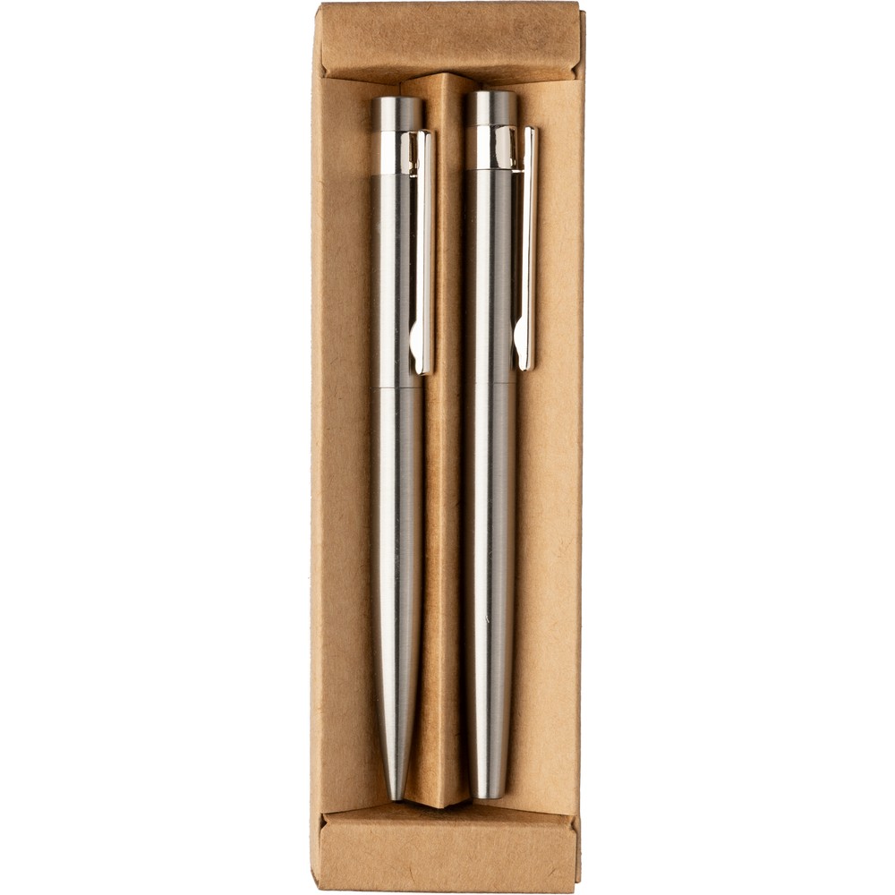 Steigern Sie die Präsenz Ihrer Marke mit unserem hochwertigen Schreibset, das einen exquisiten Kugelschreiber und einen eleganten Rollerball-Stift verbindet. Mit einem schlanken Design aus recyceltem Stahl und robustem Kunststoff, bietet dieses Set nicht nur Schreibkomfort, sondern wird auch zum stilvollen Begleiter in jeder Geschäftssituation. Die Lasergravur oder der Tampondruck ermöglicht eine prägnante Präsentation Ihres Logos, während die langlebige Verarbeitung garantiert, dass Ihr Branding im Gedächtnis bleibt.